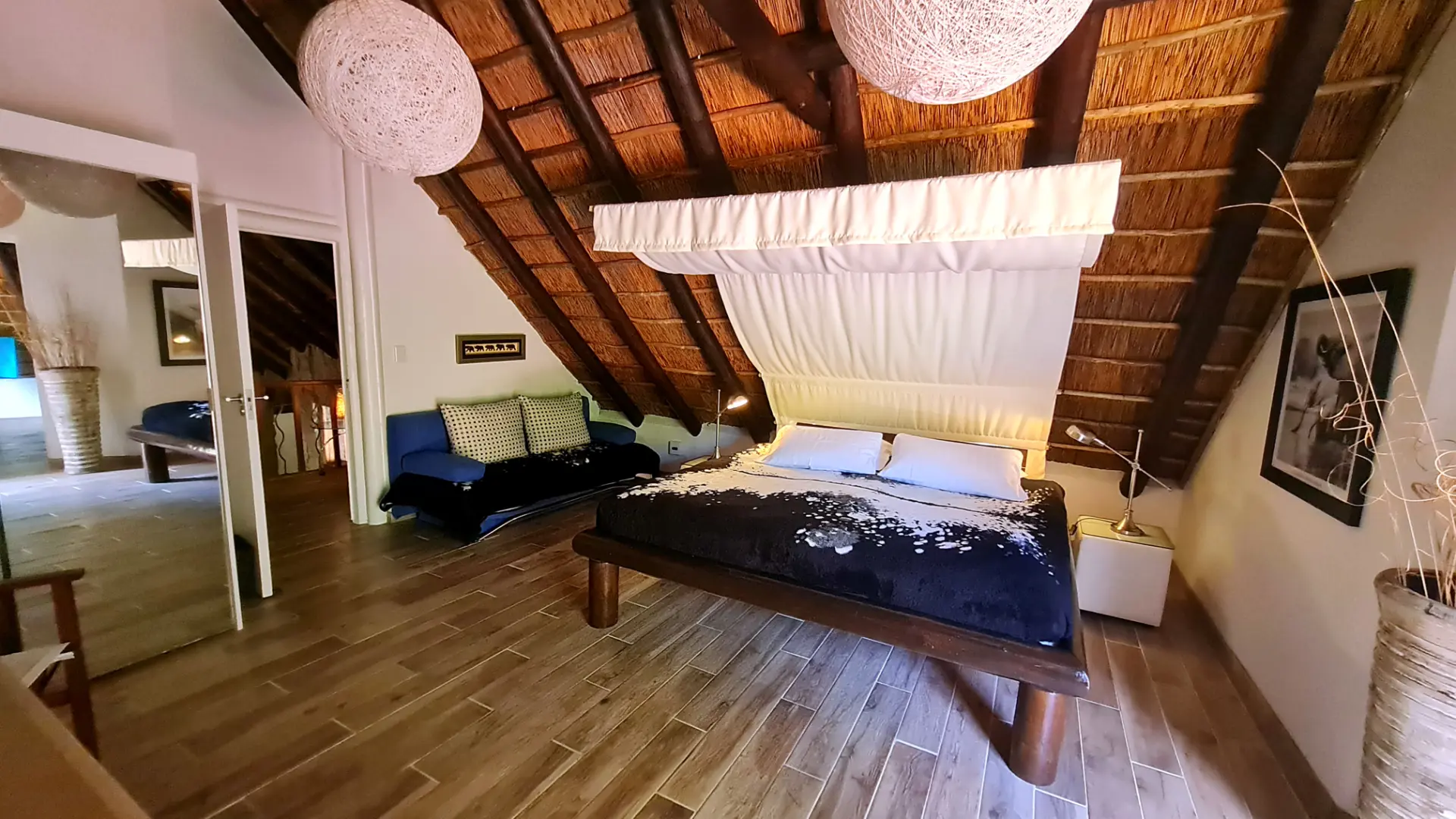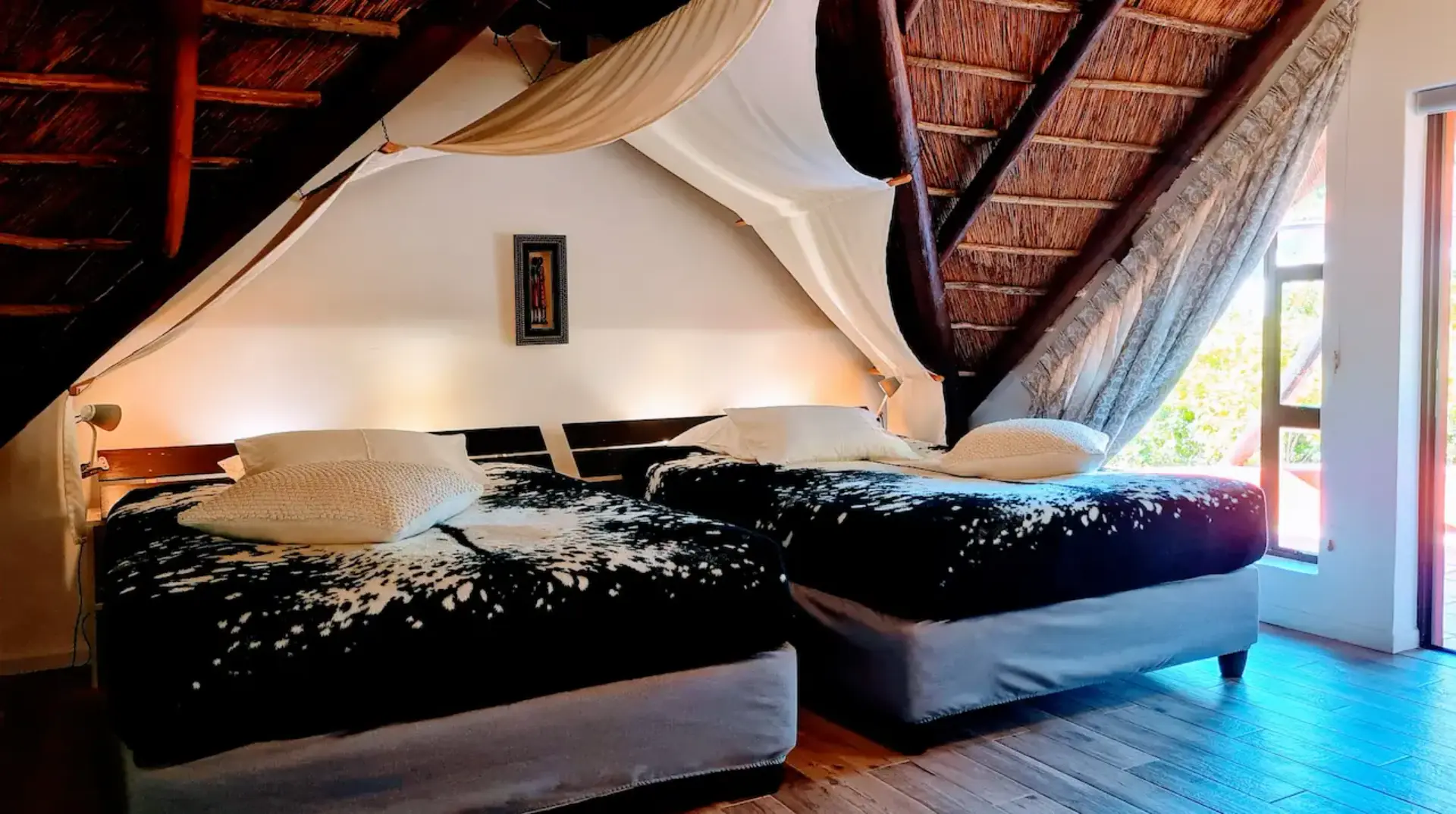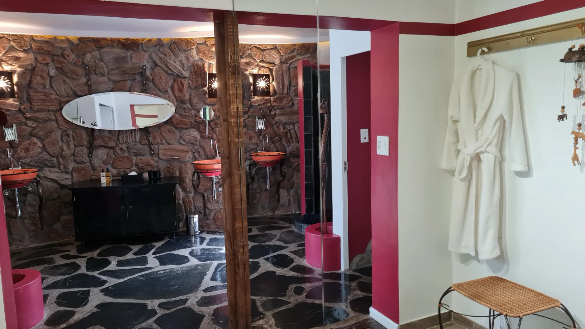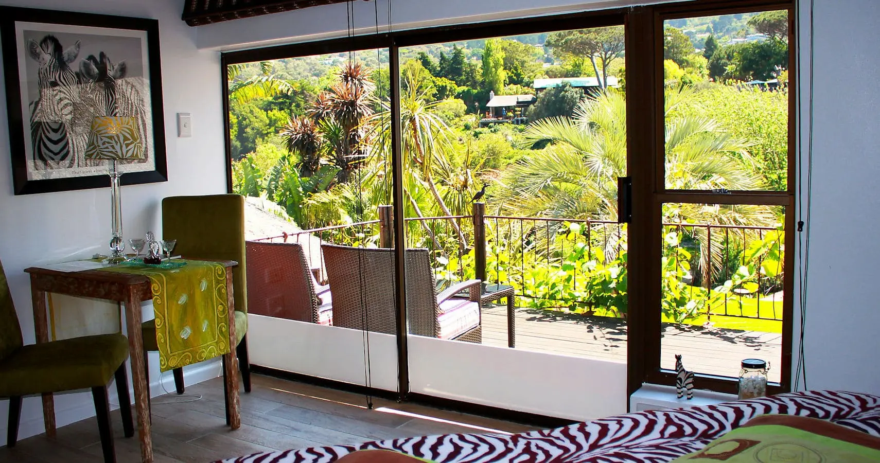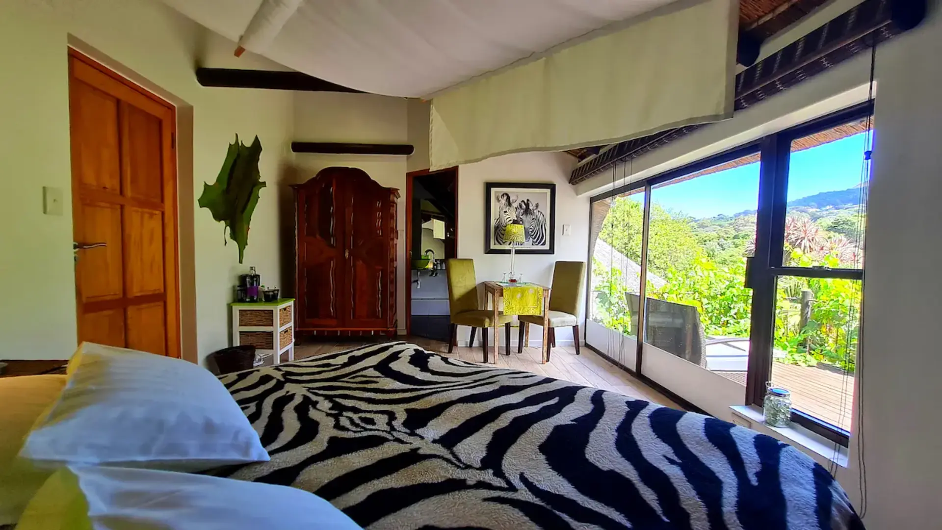 🦓 Zebra ist ein 25 m² großes gemütlich eingerichtetes Zimmer mit King Size Himmelbett und großem Balkon. Das komfortable Bad ist mit doppelbreiter Dusche mit Massagefunktion, handgearbeitetem Waschbecken, Fön und ausgesuchten Pflegeartikeln ausgestattet. Vom Ihrem traumhaften, luxuriös ausgestattetem Balkon hat man einen wunderschönen Blick auf die 12 Apostel Bergkette und unseren paradiesischen Garten mit Pool.