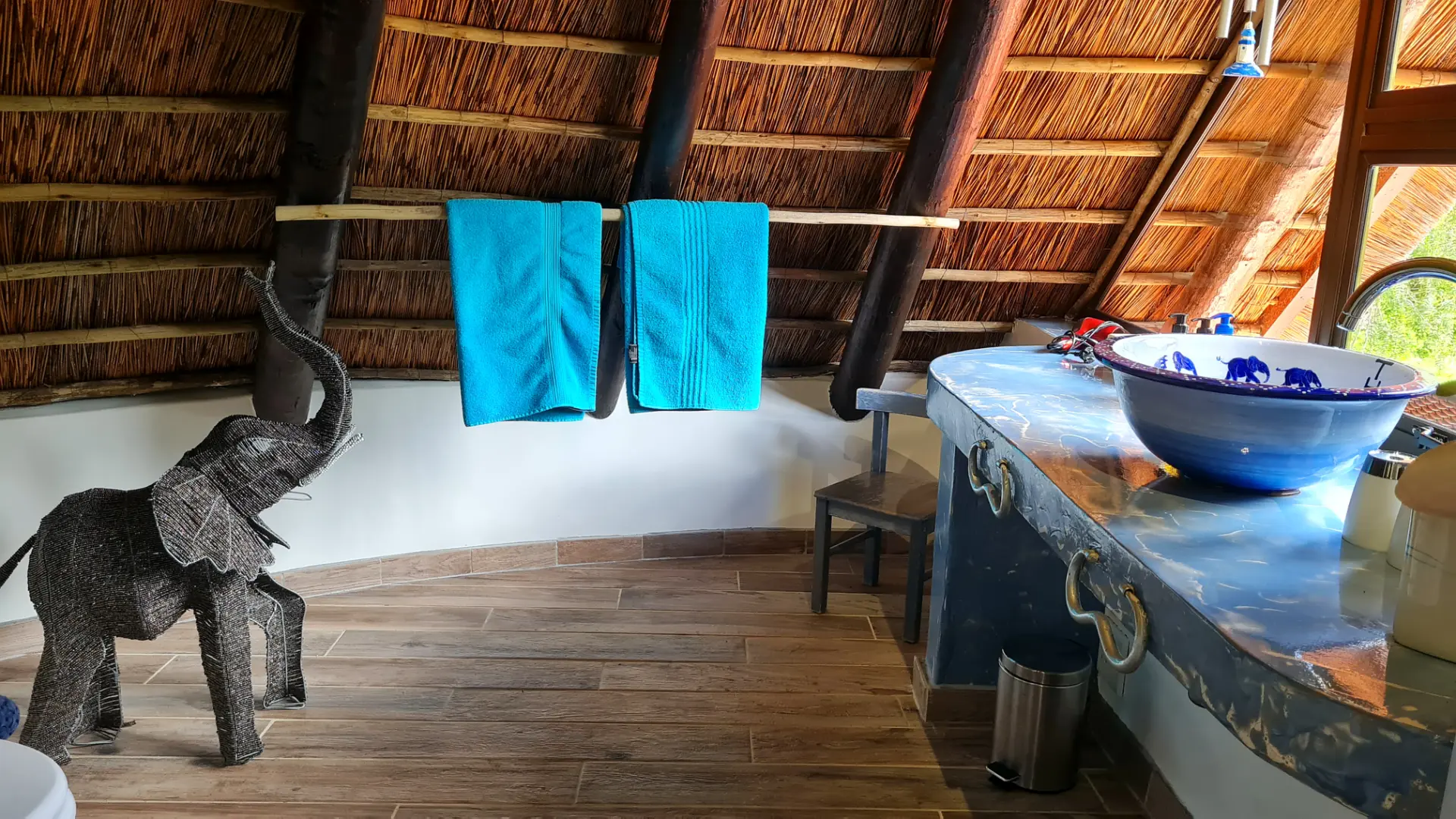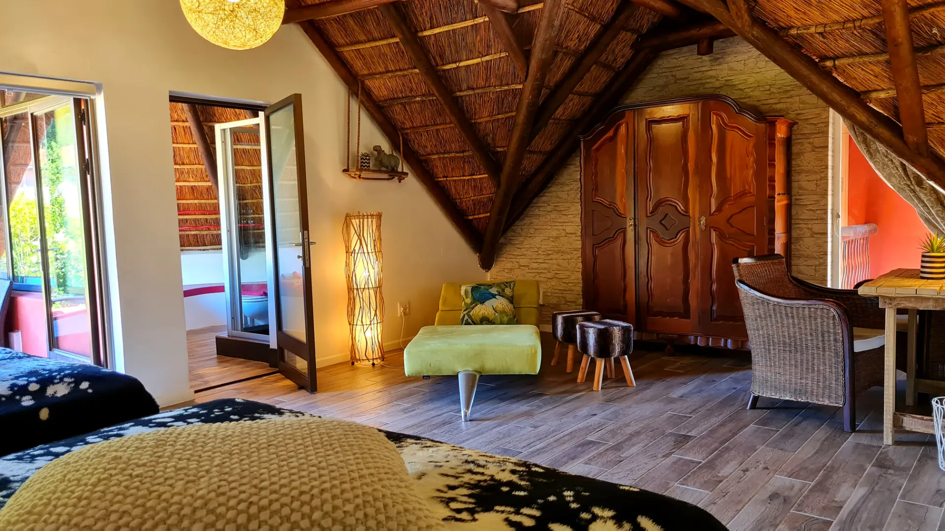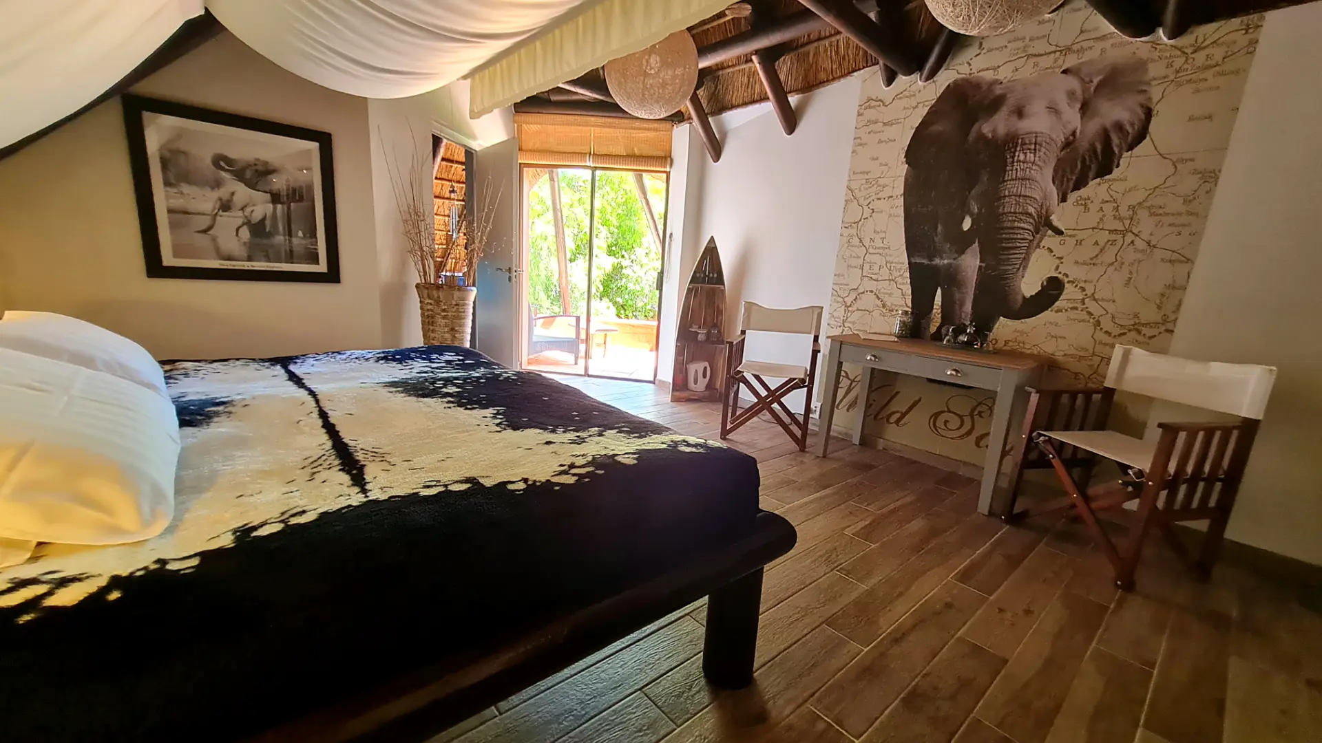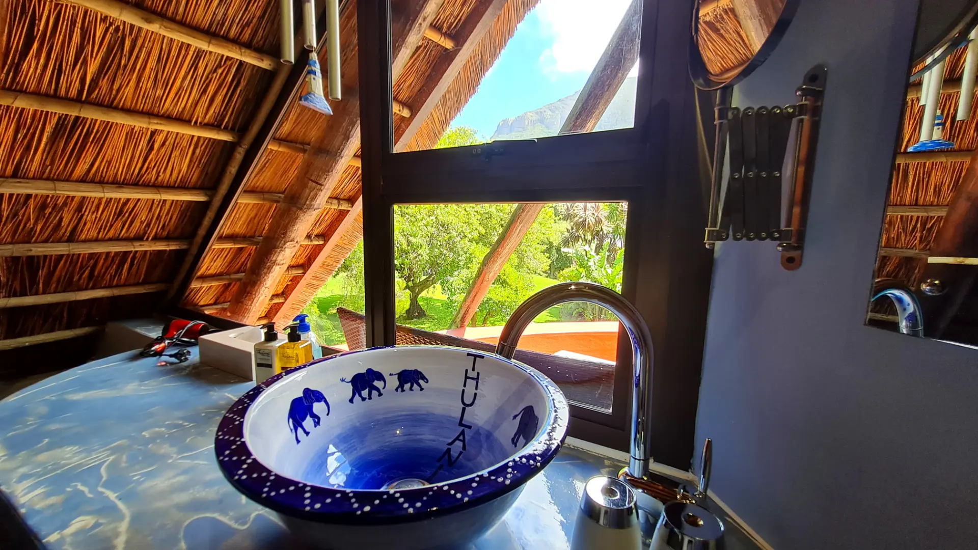 🐘 Elephant ist ein 35 m² großes, gemütlich eingerichtetes Zimmer mit King Size Himmelbett und privatem Balkon. Das Bad ist mit bequemer Dusche mit Massagefunktion, handgearbeitetem Waschbecken, Fön und ausgesuchten Pflegeartikeln ausgestattet. Vom Ihrem schönen Balkon blickt man auf unseren paradiesischen Garten und die 12 Apostel Bergkette. Für ein bis zwei Kinder steht zudem eine bequeme Schlafcouch zur Verfügung.