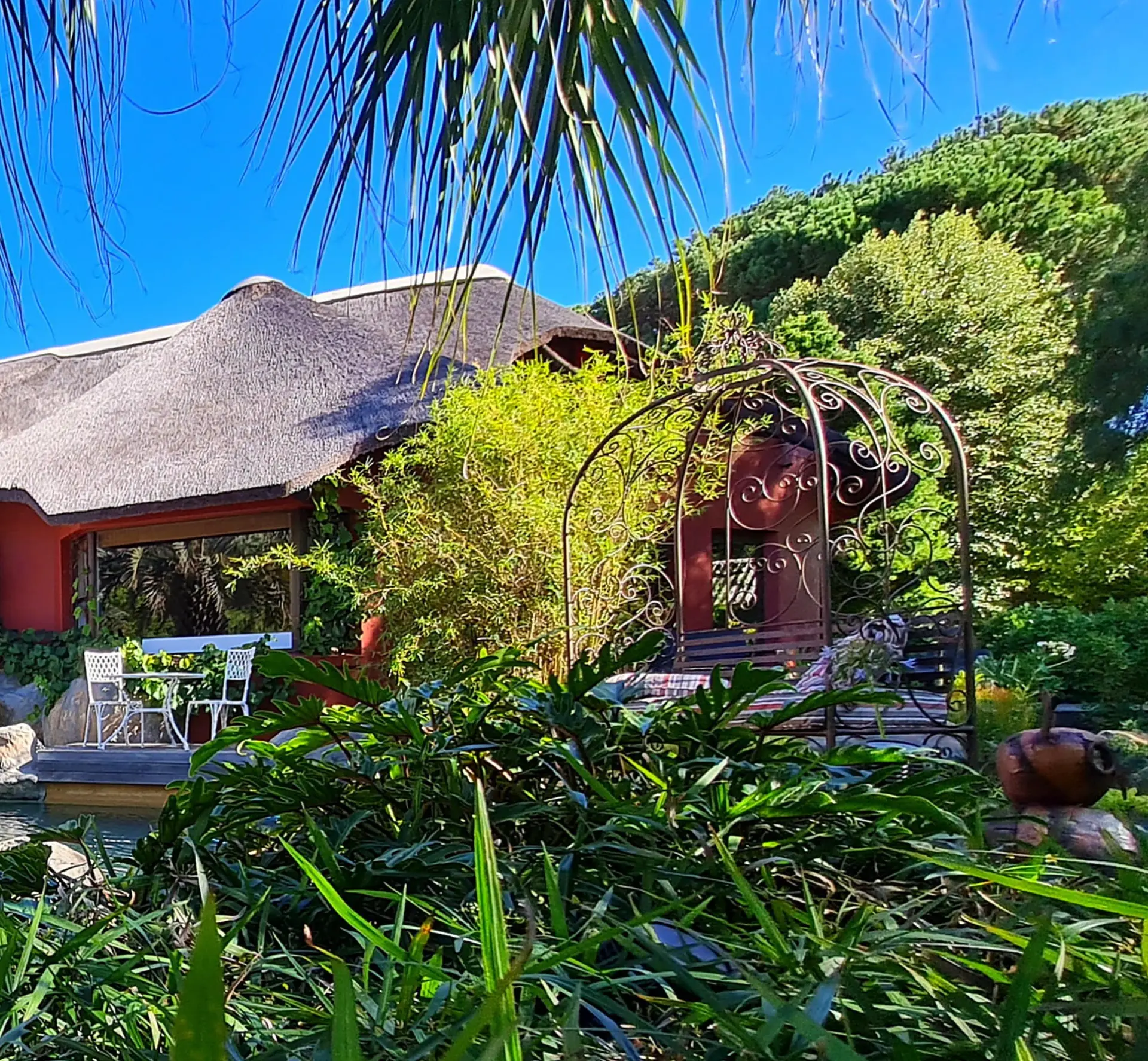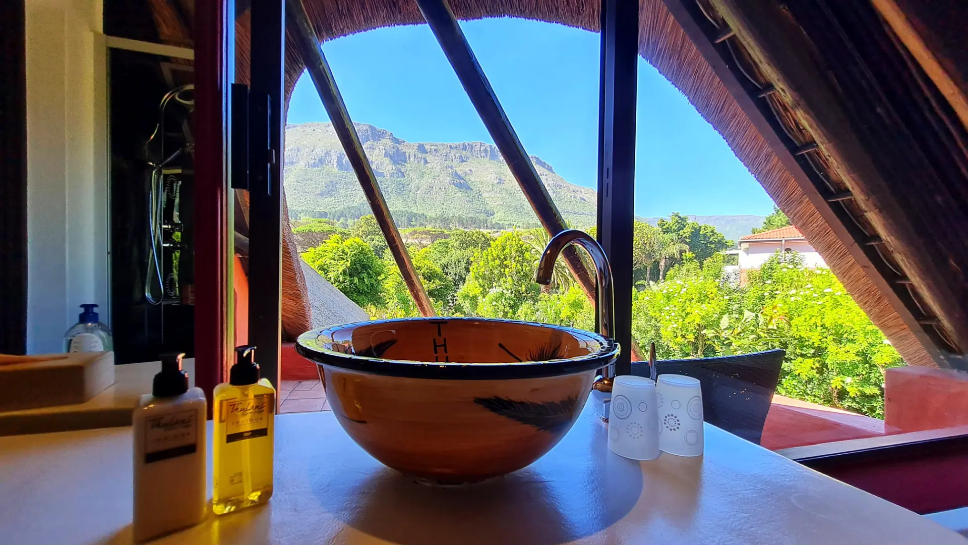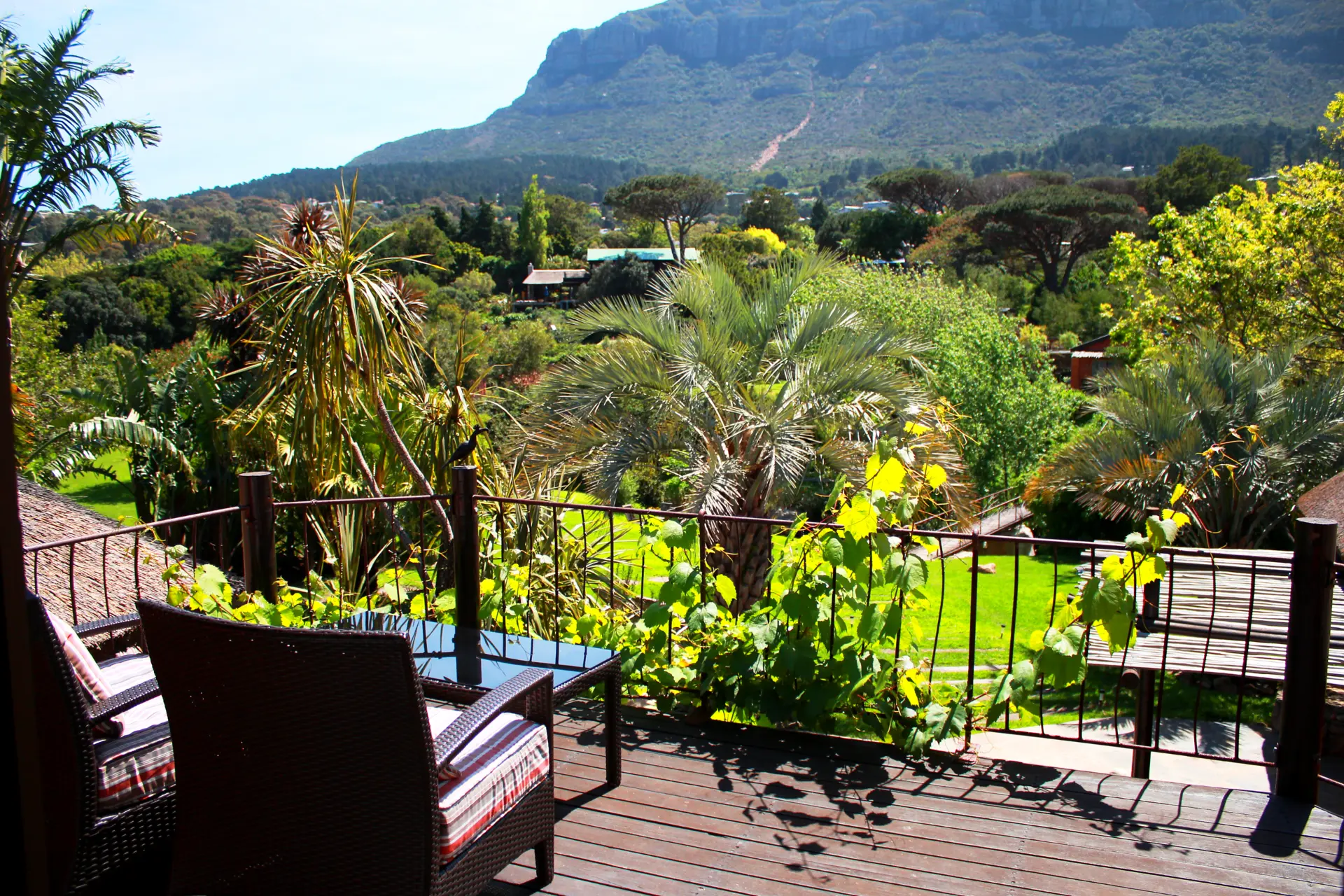 Zu jedem Zimmer gehören traumhafte Terrassen oder Balkone, die einen paradiesischen Blick auf den Tafelberg, die 12 Apostel und unseren Constantiaberg freigeben. Die großzügigen en-suite Bäder sind mit individuell handgearbeiteten Waschbecken, modernen Massage- oder Wasserfallduschen sowie Föhn und ausgewählten Pflegeartikeln ausgestattet.