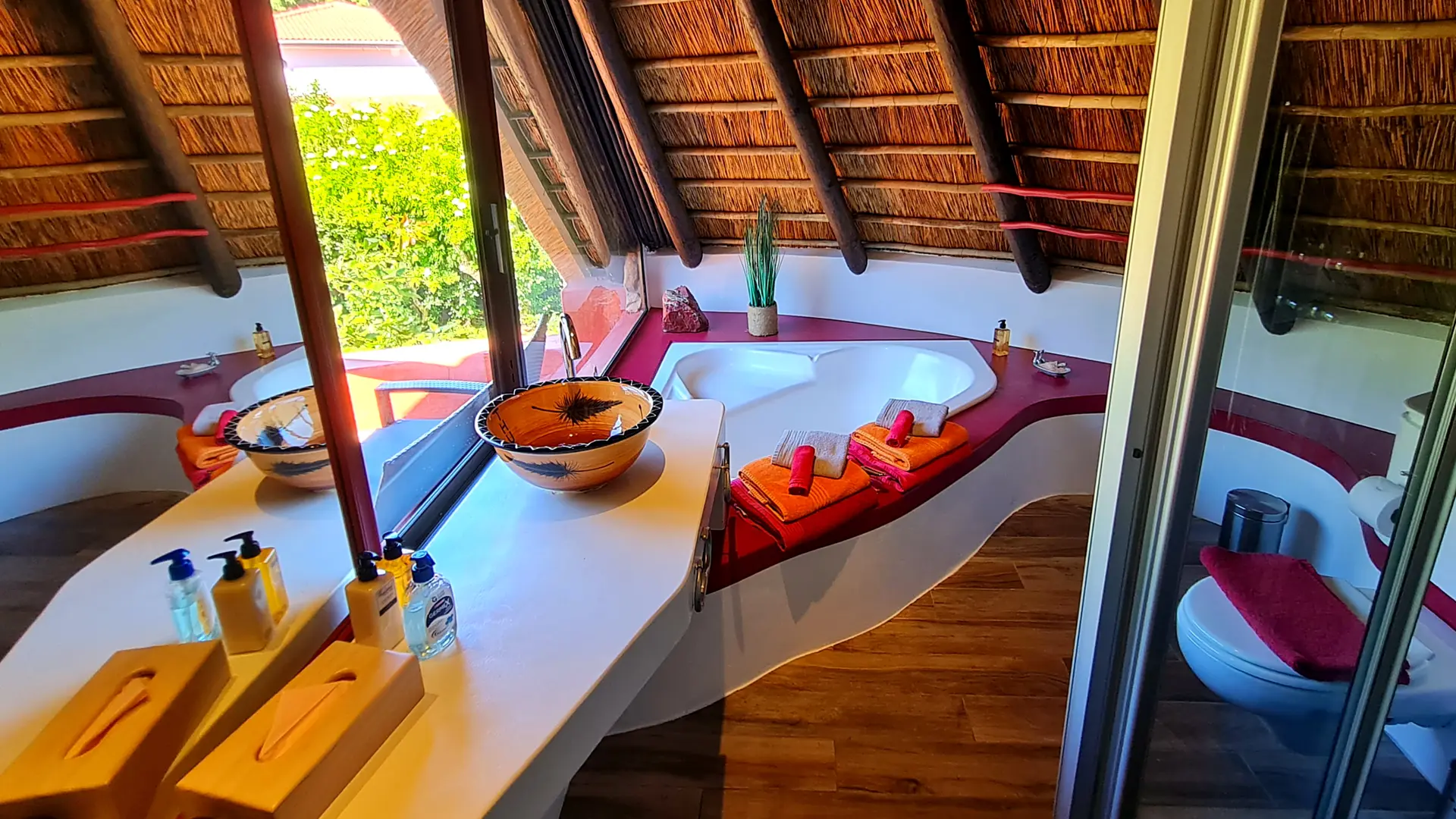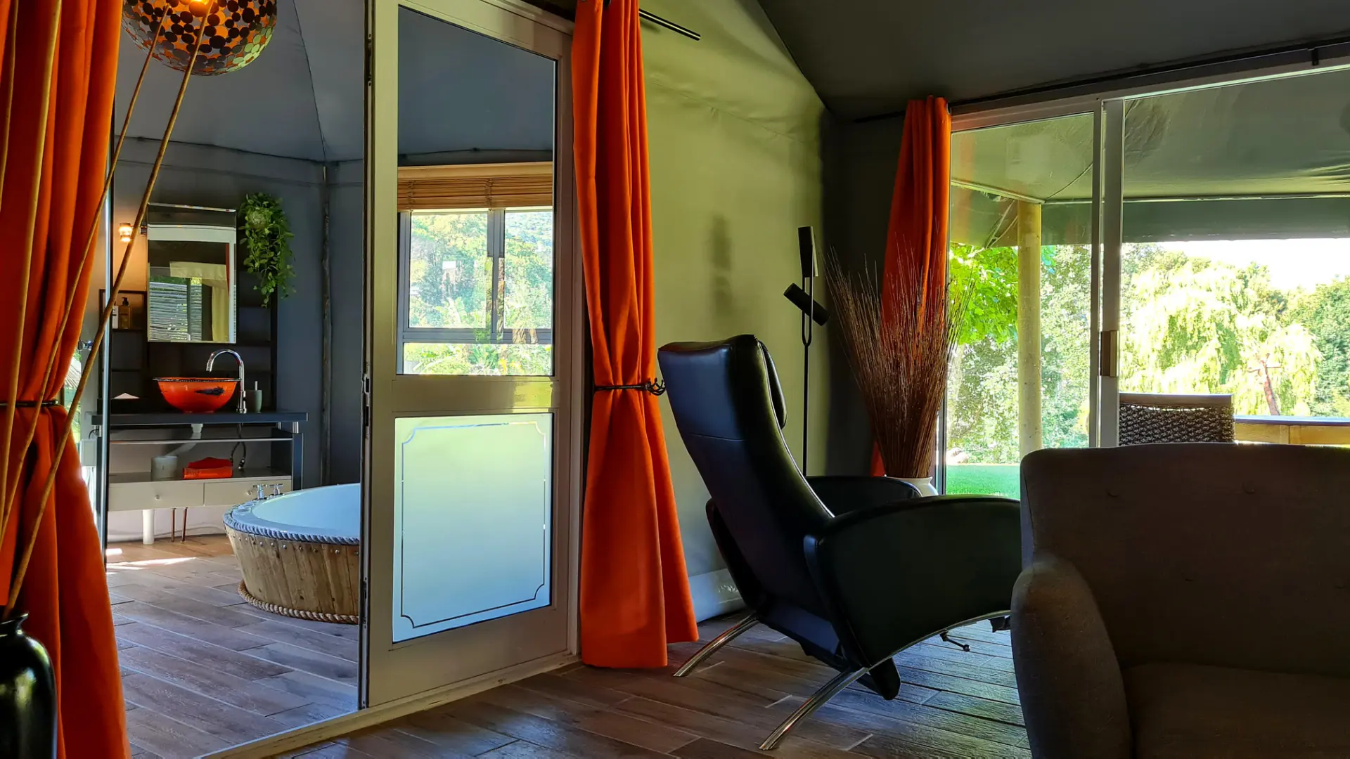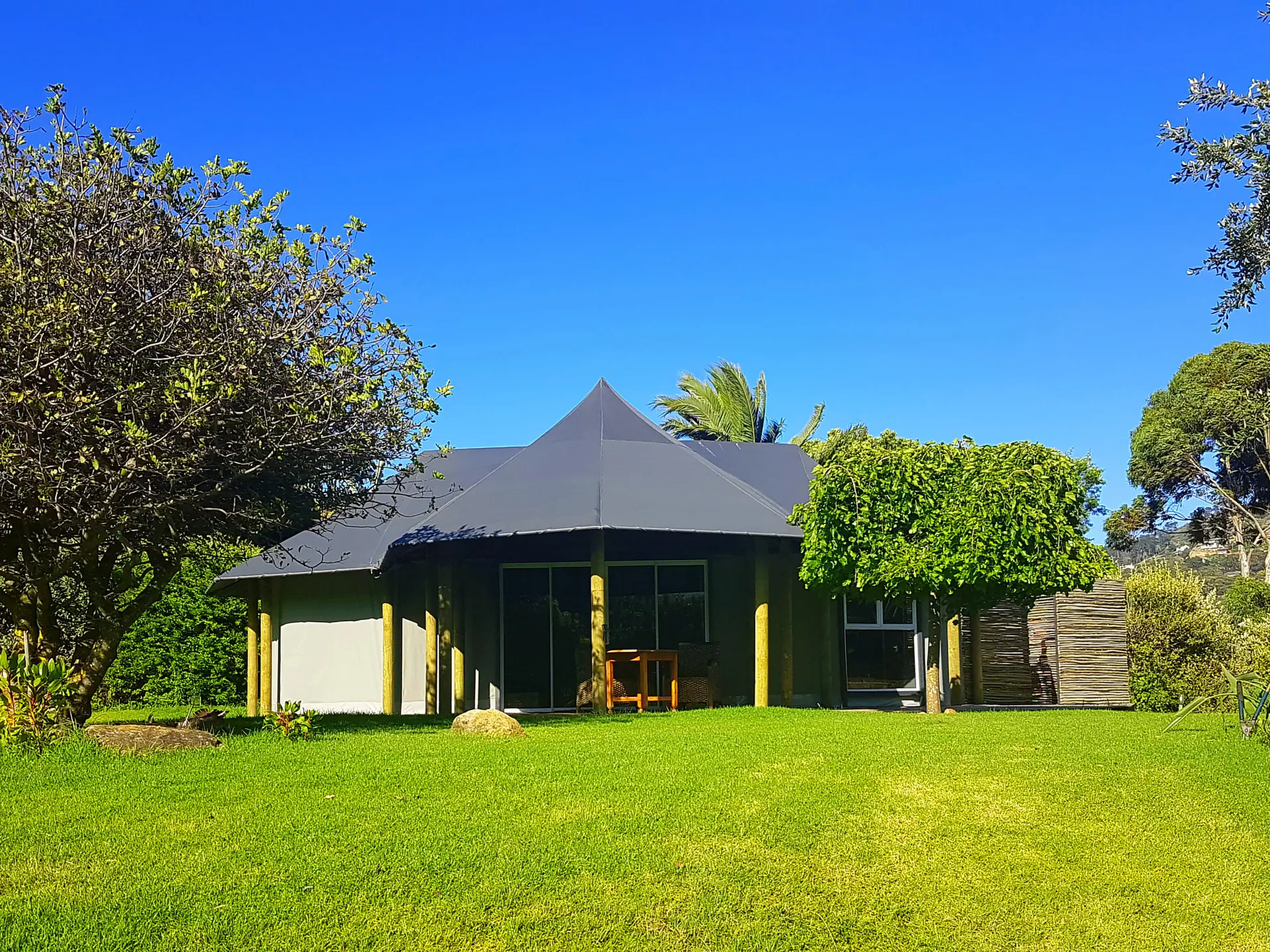 🦏 Rhino ist eine 50m² große Suite. In privater Atmosphäre, mit traumhaftem Blick auf das Tafelbergmassiv können Sie die schönsten Sonnenuntergänge erleben. Ausgestattet ist das Safari Zelt mit einem King Size Himmelbett, geschmackvoller Sitzecke und großer gemütlich eingerichtete Terrasse. Das außergewöhnliche ensuite Badezimmer bietet eine große walk-in Dusche, einen Whirlpool, zwei Waschtische mit handgearbeiteten Waschbecken, Fön und ausgesuchte Pflegeartikel. Zudem bietet Rhino eine private Außen Dusche. Von Ihrer schattigen Terrasse haben Sie einen unvergesslichen Ausblick auf den Tafelberg, die 12 Apostel Bergkette und unseren paradiesischen Garten mit der unvergleichlichen Vielfalt an hiesigen Pflanzenarten und Bäumen. Die Suite ist voll klimatisiert, hat aber auch eine Fußbodenheizung für kühlere Abende.