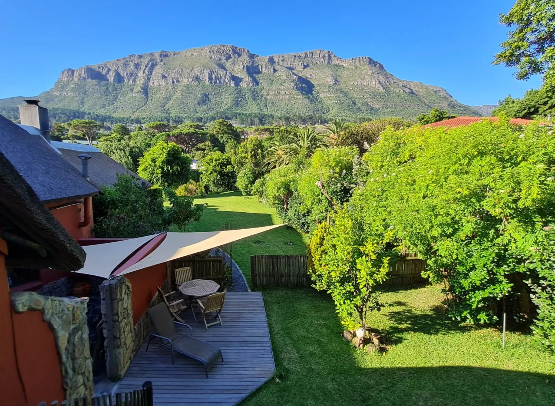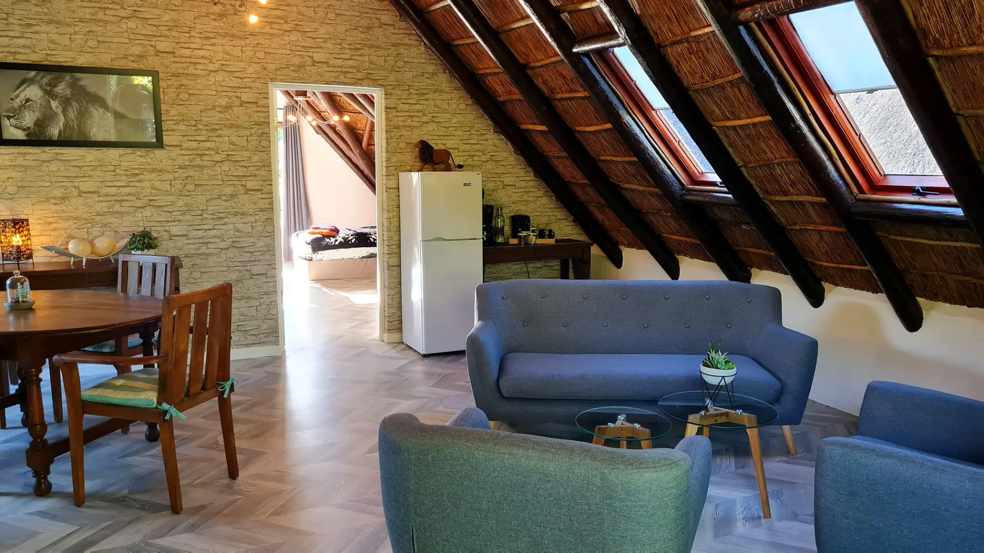 🦁 Lion ist eine 60m² große, komfortable Suite und bietet ein gemütliches Wohnzimmer mit angrenzendem Balkon, von dem man einen herrlichen Blick auf den Tafelberg mit den 12 Apostel Bergen und auf unseren paradiesischen Garten genießen kann. Angrenzend finden Sie ein großes gemütliches Schlafzimmer mit en-suite Bad. Das Wohnzimmer ist modern eingerichtet mit Essecke, Couchgarnitur und einem Tagesbett und bietet zudem einen großen Kühlschrank. Im Schlafzimmer befindet sich ein King Size Himmelbett und zwei Single Size Betten. Das moderne Bad verfügt über eine Dusche mit Massagefunktion, ein handgearbeitetes Waschbecken, einen Fön und ausgesuchten Pflegeartikeln. Diese Suite ist voll klimatisiert.