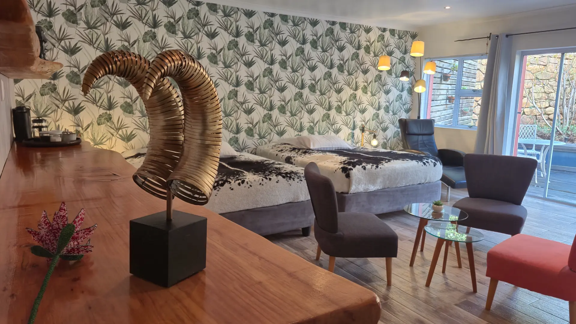 🌺 Protea ist ein 40 m² großes, geschmackvoll eingerichtetes Twin Zimmer mit zwei Queen Size Doppel- Betten, gemütlicher Sitzecke und privater Terrasse. Das Ambiente ist großzügig und modern gestaltet. Das geräumige Bad bietet eine Walk in Dusche mit Massagefunktion, ein handgearbeitetes Waschbecken, einen Fön und ausgesuchte Pflegeartikel. Die große, gemütlich ausgestattete Terrasse ist in einen Proteengarten mit einheimischen Pflanzen eingebettet.
